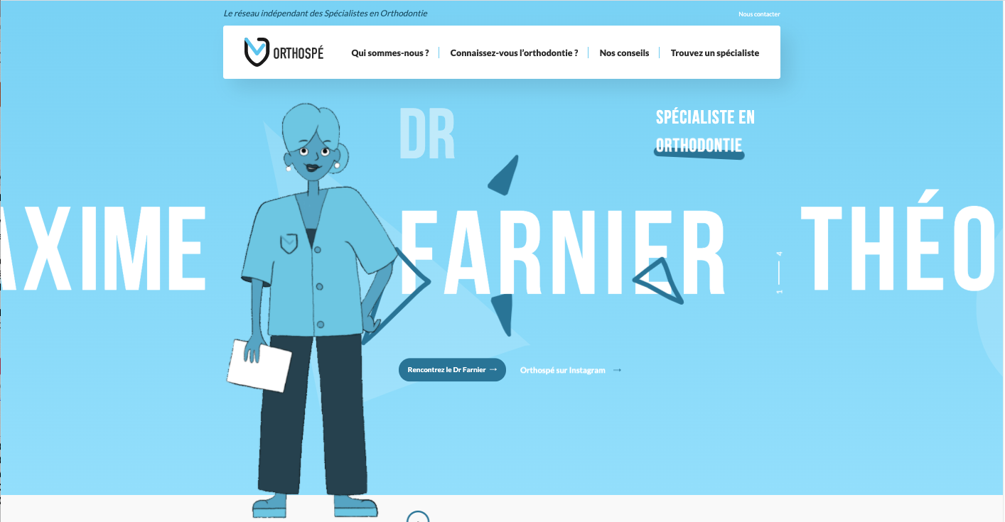 - Créer un site internet dédié au label www.orthospe.fr : Un site internet pédagogique, informatif et ludique a été créé en amont du lancement du label. Ce site permet au grand public de mieux comprendre la spécialité et d’en apprendre plus sur les différents parcours patients possibles grâce aux pages dédiées aux 3 personnages Maxime, Sarah et Théo. Le site permet également de découvrir les bonnes pratiques au travers de conseils et d’un quiz. Enfin, les patients peuvent trouver un orthodontiste spécialiste près de chez eux grâce à un annuaire.